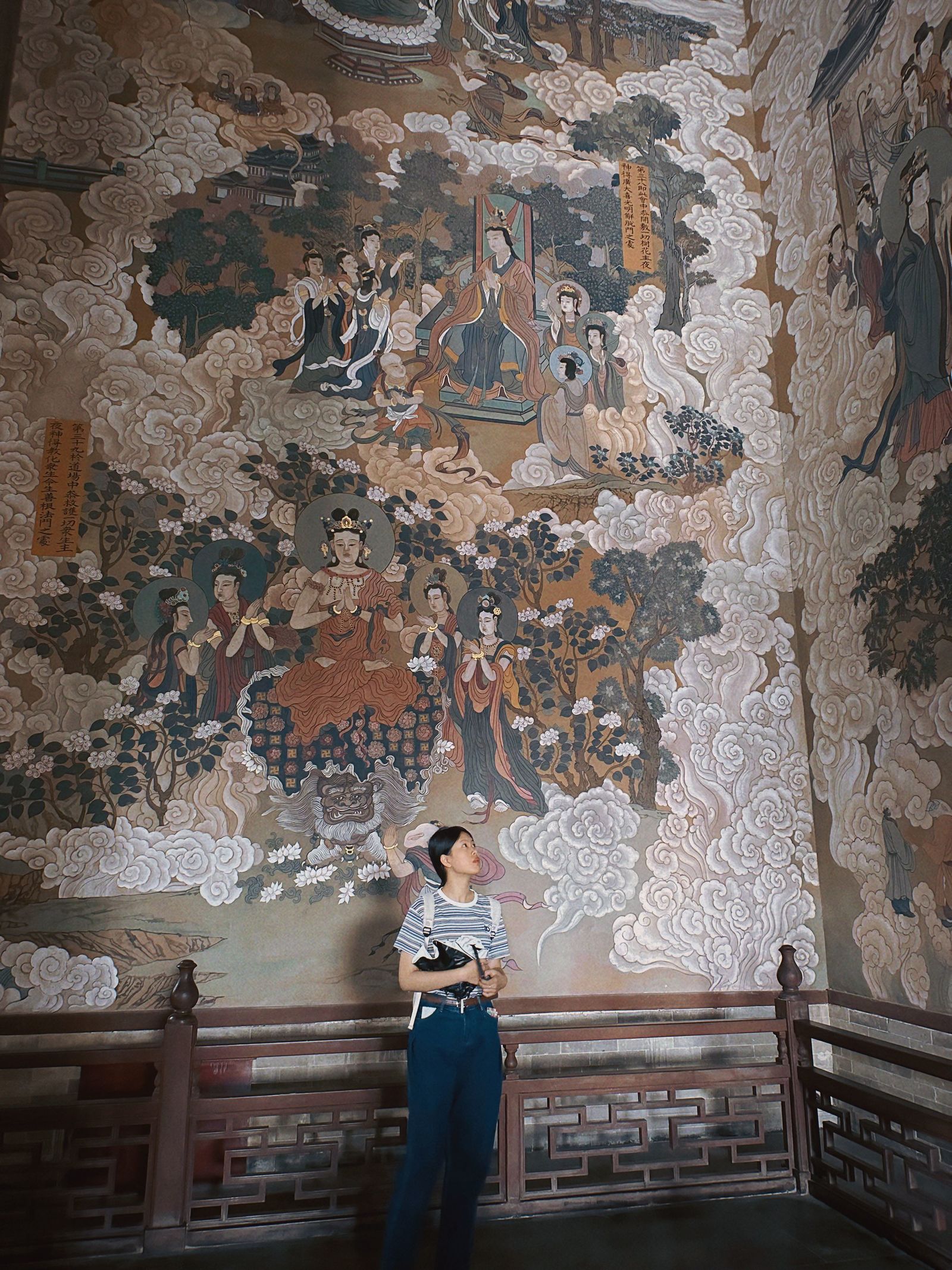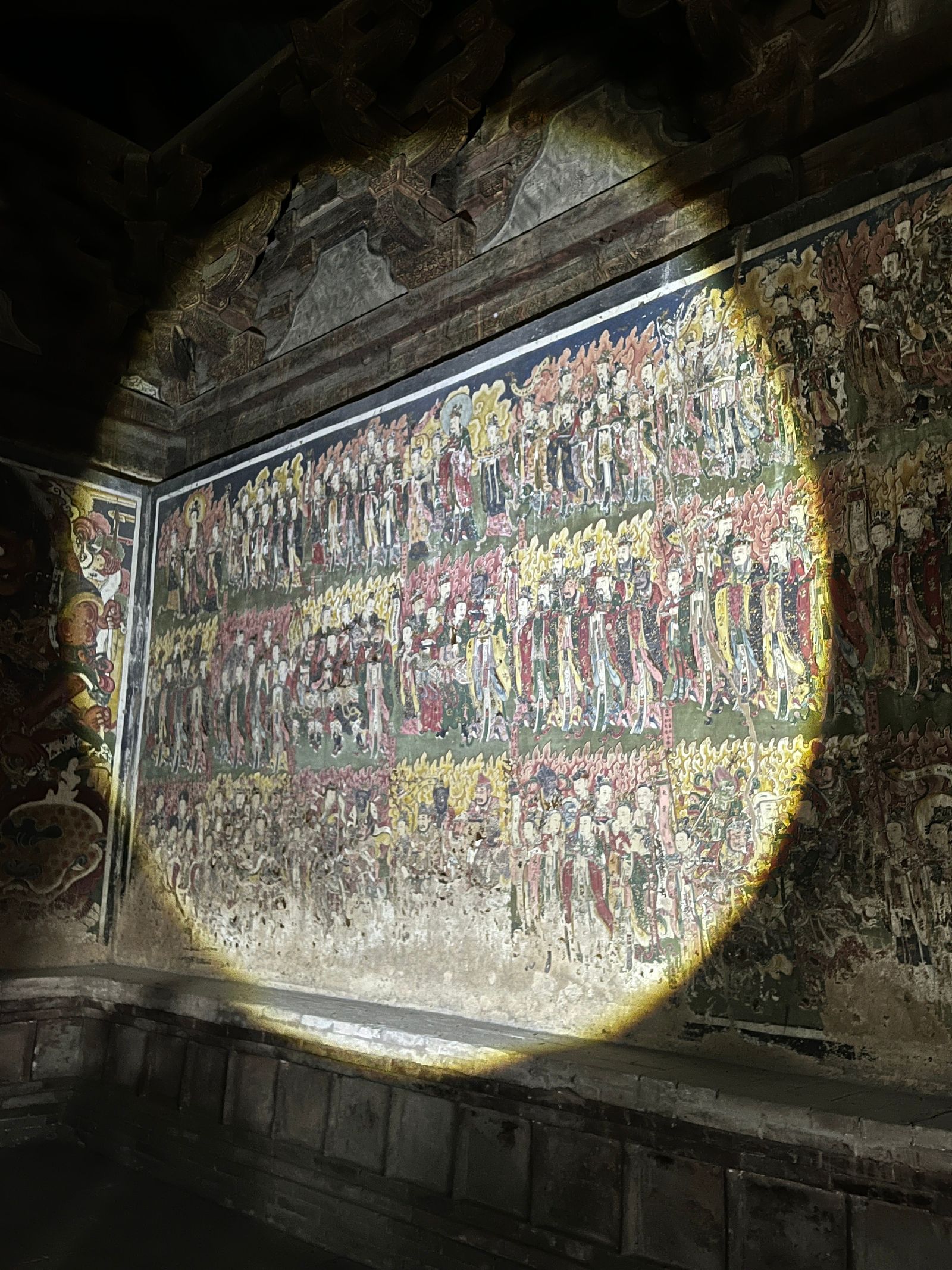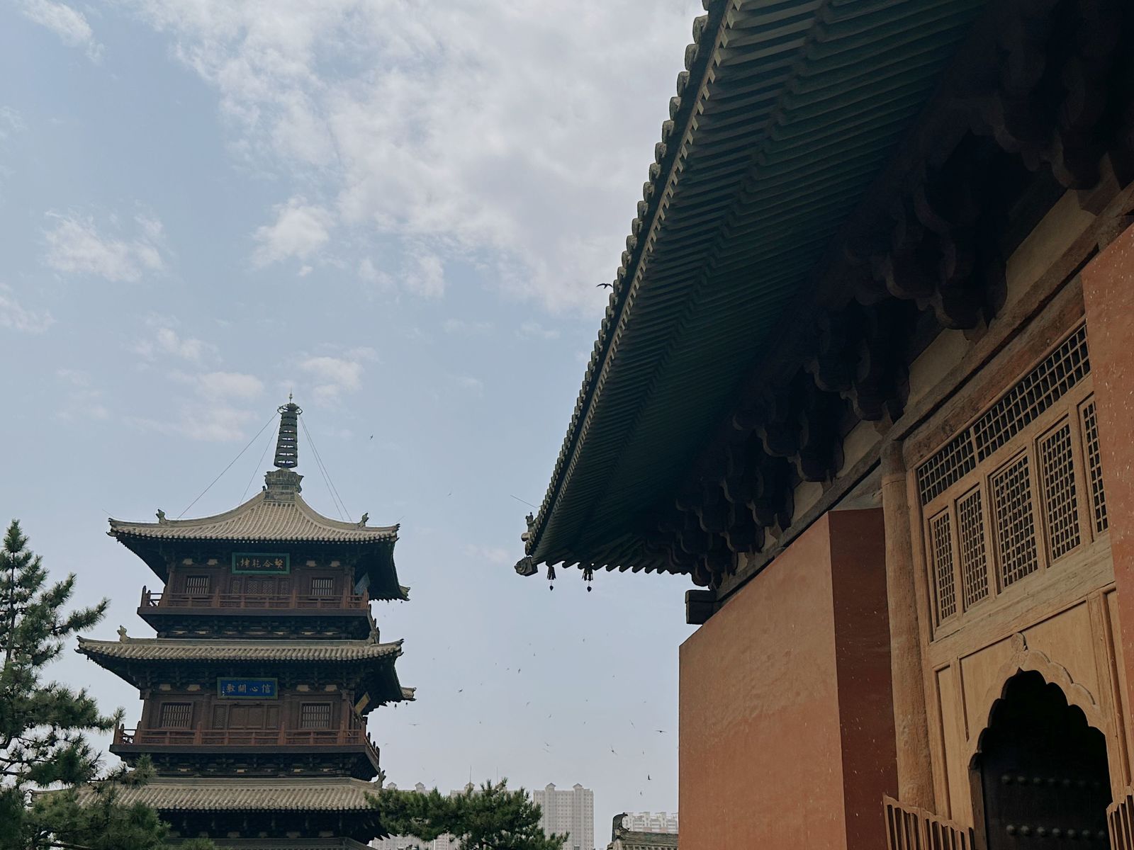 3日,实践团前往朔州,参观了应县木塔。木塔八角五层,屹立近千年,其内外两周、明暗层的设计与梁柱、斜撑、斗拱等受力部件的组合兼具受力作用与结构之美,反映了中国传统木构单体建筑的至高水平,实践团员从中深切感受到了中国古代劳动人民的才干与创造力,增进了对传统木构建筑的结构与美学价值的认识。出应县木塔,实践团继续东行,先后走访浑源县净土寺、悬空寺与永安禅寺,对当地风土壁绘及藻井建制进行考察记录。