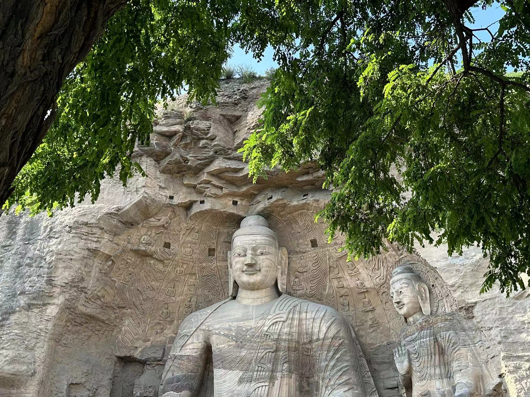 2日下午,实践团前往位于大同西北的云冈石窟。云冈石窟开凿于北魏时期,“凿石开山,因岩结构,真容巨壮,世法所希”。从以北魏帝王为原型的昙曜五窟造像开始,自西向东,造像的风格由犍陀罗逐步汉化,涌现出“二佛并坐”等具有时代特色的题材,折射出北魏建都平城、太和改制、迁都洛阳数十年间民族融合与文化交融的历程。考察团在此进行拍摄记录,并及时分析该古迹的目前开发状况。