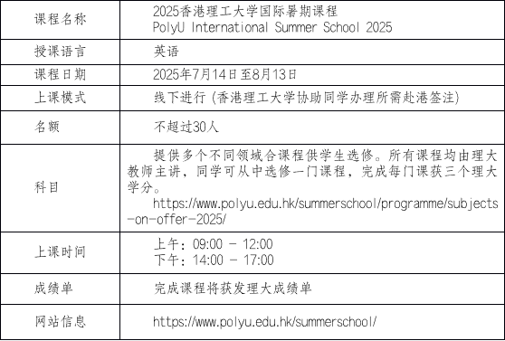 国际暑期课程将于2025年7月至8月期间线下举办,邀请来自世界各地的大学生于暑假期间到理大交流学习。暑期课程为期四周,提供多个不同领域的课程:如“中国社会,文化与语言”、“设计、创新与科技”和“商业、创业与国际领袖”。所有课程都由理大教授主讲,同学可从中选修一门课程。